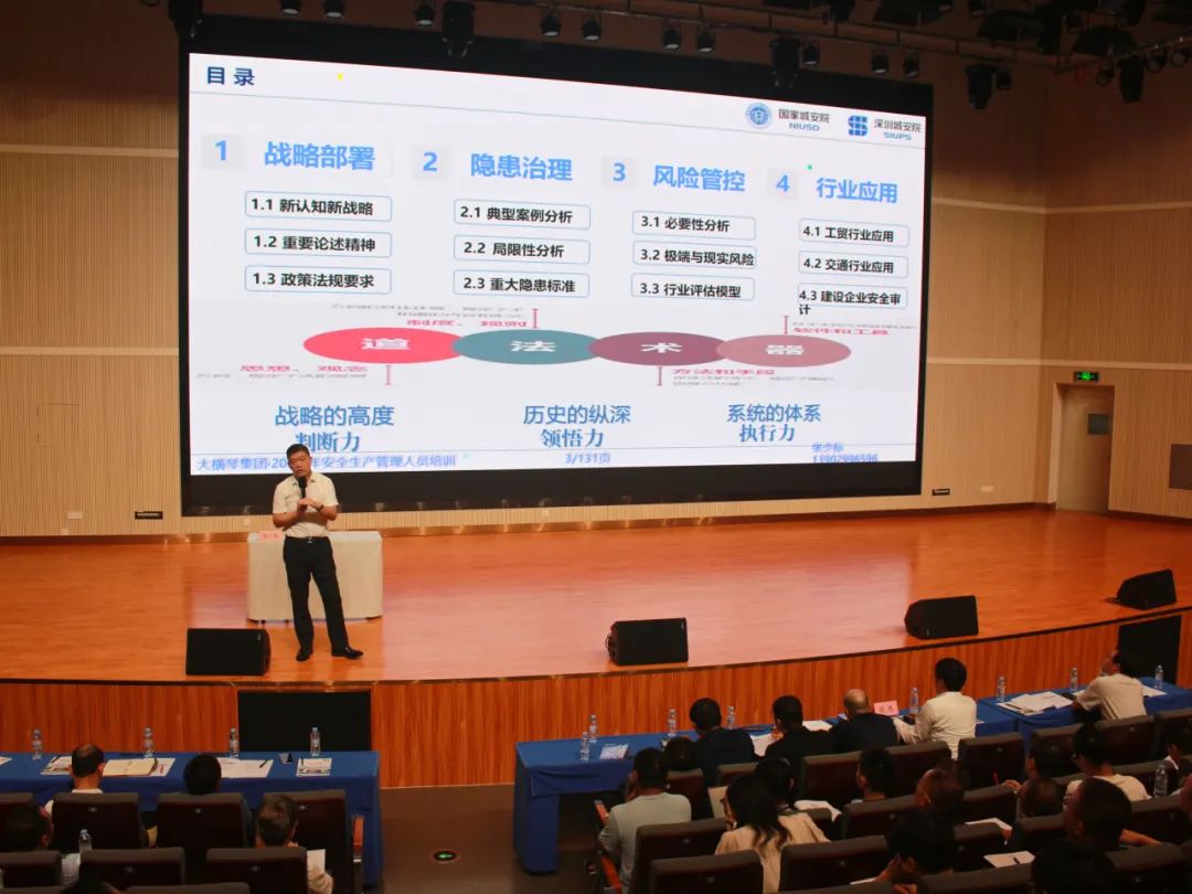 本次培训班为期一天,培训对象包括集团本部业务骨干,各下属企业安全总监、安全生产和生产经营(工程)部门负责人及业务骨干等170余人。培训方式为外部专家讲课,培训紧紧围绕“拓展管理思路、提高管理质效”的主题,重点剖析安全风险分级管控和隐患排查治理双重预防机制,进一步探讨企业落实安全生产主体责任的对策建议。