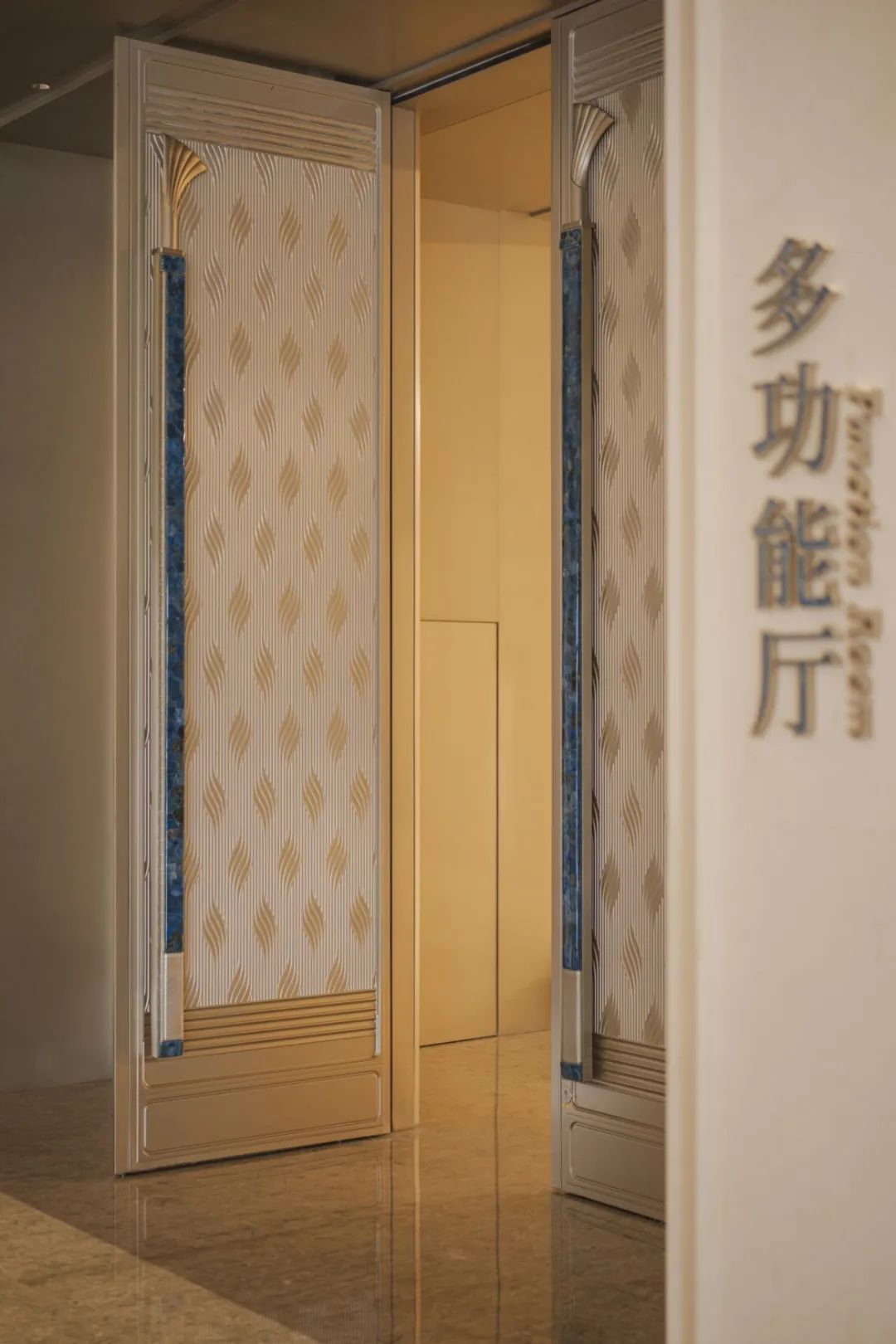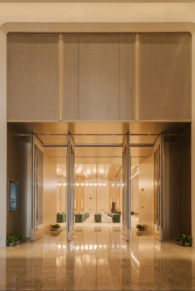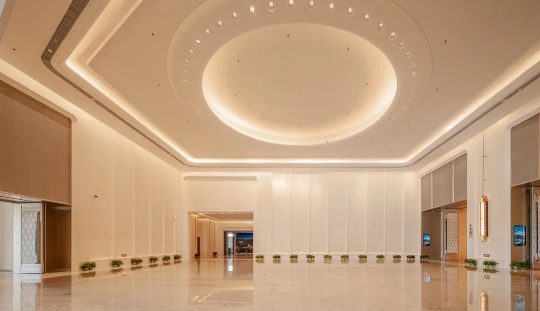 会议中心前厅顶面采用25朵花代表澳门回归祖国25周年,造型中提取木棉花、莲花写意形体作为装饰元素,图案相互交错,寓意“一国两制”方针下粤澳共商、共建、共管、共享的新模式。